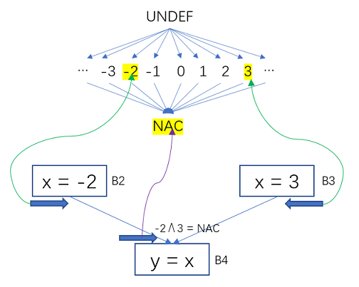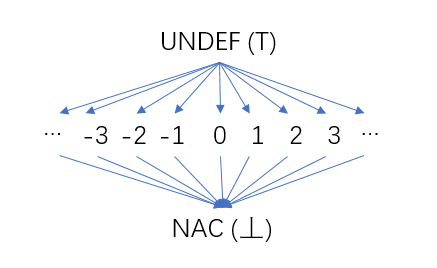 过程(函数)中的每一个变量都这样的一个半格,变量的值就是半格中的元素。在常量传播分析的初始阶段,所有的变量的值是不确定的,我们用UNDEF表示(对应格论中的最大值⊤);随着我们的分析,有些变量的值是常数,它的值就可以对应到半格的中间那一行的某一个元素,比如常数2。随着分析的进行,一些变量的值不是常数时(比如定值来自不同的前驱,每个前驱中对该变量的定值不同),用半格最底下的NAC(Not a Constant)表示(对应格论中的最小值⊥)。