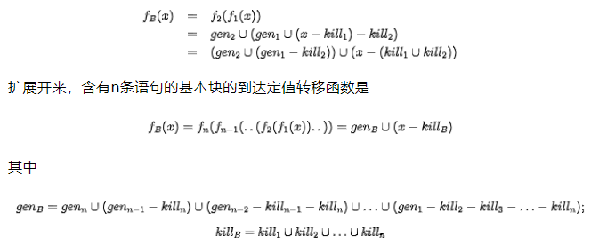 基本块的转移函数由基本块的每一个语句的转移函数组合构成。比如2个语句组成的基本块的到达定值转移函数是