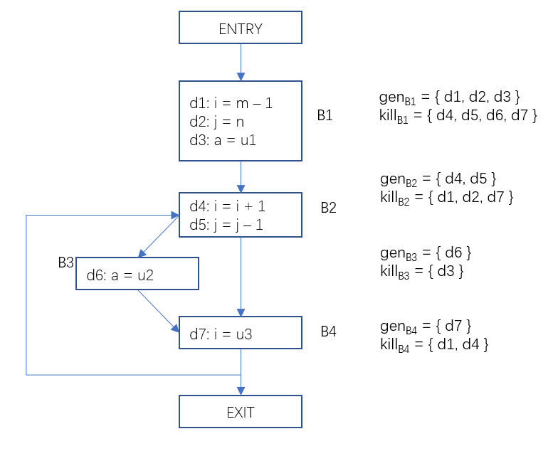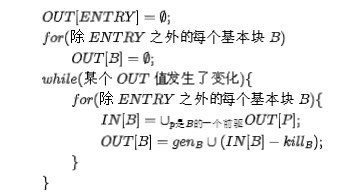 说明:此算法是非SSA表示上的到达定值分析的算法,这里用这个相对来说比较原始的算法旨在介绍它最基本的思路;如果要在SSA形式上进行到达定值分析会更加高效,前提条件是需要把程序转换为SSA形式的表示。后续介绍的活跃变量分析,可用表达式分析也是如此。