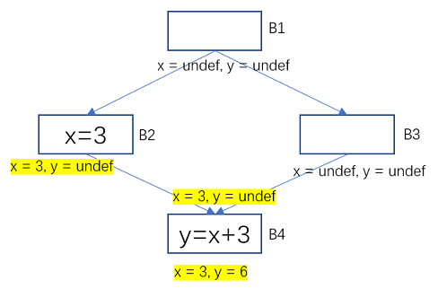 例如下面的一个流图,黄色标记表示因为程序语句的影响而发生变化的变量状态。变量x在基本块B2中的值是3, 在B3中的值是undef, 他们汇合后(最大下界)是常数3。在B4中,x是常数3, x + 3 就是常数6,所以B4中的指令就可以优化为 y = 6了。