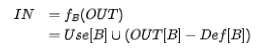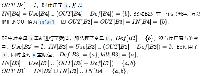 对于上面的控制流图,B2前驱节点包括B1和B2自身。B2的输入状态需要汇合B1结束后的状态OUT[B1] 和 B2结束后的状态OUT[B2], 如何汇合呢?这取决于我们的分析目的,对于到达定值分析,我们要汇集所有路径上过来的定值集合,所以对前驱节点的输出做并集运算OUT[B1]∪OUT[B2];而对于可用表达式分析,只有每一条通往此基本块的路径上都有这个表达式的生成时我们才说这个表达式在此基本块上是可用的,所以交汇运算是求交集OUT[B1]∩OUT[B2]。交汇运算用符号∧表示。